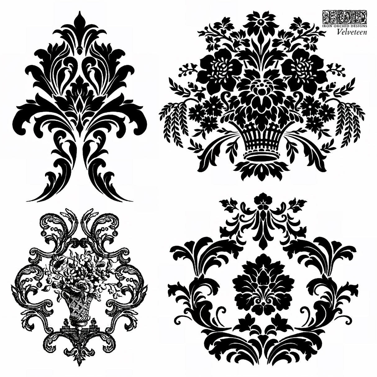 IOD Velveteen Decor Stamp by Iron Orchid Designs is four gorgeous damasks all tucked into a darling little set. The name Velveteen is inspired by visions of an ornate design once full of grandeur yet worn to a commonly quaint use in a shabby French cottage. Velveteen is a tribute to the beauty of damask, which has graced interiors since it arrived in Europe during the 14th century.